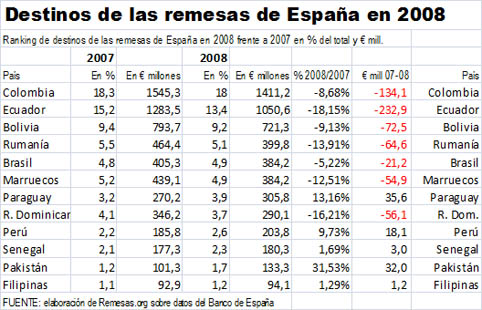 El ranking de los destinos de las remesas de España en 2008 siguió encabezado por Colombia con el 18% del total de las remesas, o bien €1.411 mill. frente a los 1.545 de 2007. Al igual que en años anteriores, Ecuador ocupa la segunda posición con el 13,4% del total, una caída de dos puntos frente al 15,2% de 2007. Esto supone que Ecuador recibió remesas por valor de €1.050 en 2008, con una notable caída frente a los 1.283 de 2007. El tercer lugar es para Bolivia con €721 mill. frente a los 793 de 2007. Los demás puestos del ranking se mantienen, salvo Paraguay que adelanta a la R. Dominicana.