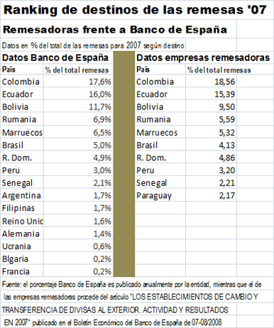 El motivo de añadir otros datos es que las empresas remesadoras ejecutan un alto porcentaje de las remesas que envía España, en torno al 70%, pero no la totalidad, lo que aconseja utilizar otras fuentes. Así, mientras los remesadores declararon que en 2007 habían realizado el 18,56% de sus envíos a Colombia y el 15,39% a Ecuador, El Banco de España asignó finalmente a Colombia el 17,6% de los envíos y a Ecuador el 16,0%. Como se puede ver en el cuadro, la diferencia entre los demás destinos era de este orden con un elemento añadido, mientras el Banco de España desagregaba los 16 principales destinos ordenados por continentes, las empresas remesadoras solo desagregan los doce principales sin más criterio que su volumen total. En la actual edición, el Banco de España ha abandonado la práctica de completar la información de las empresas remesadoras con otros datos. Simplemente se publican los datos que ofrecen estas entidades dando término a la práctica de completarlos con otra información. El Banco de España no informa sobre el motivo. Esto explica porque los datos de 2008 que aquí se recogen son diferentes a los publicados hace un año, que estaban basados en una metodología diferente.