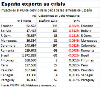 Por ejemplo, Ecuador, recibió en 2008 €232 millones menos que en 2007, una cantidad que supone $343 millones, o bien el 0,65% del PIB ecuatoriano. Dicho esto, hay que añadir las remesas enviadas a Ecuador desde España suponen nada menos que el 2,9% de su PIB. Le sigue en este ranking de impacto negativo Bolivia, que en 2008 recibió €72 millones menos o bien $107 millones, lo que supone el 0,61% del PIB boliviano. Las remesas de España que sí llegaron a Bolivia suponen el 6,1% de su PIB. La caída de las remesas entre 2007 y 2008 supone el 0,18% del PIB de la República Dominicana y casi el 0,1% del de Marruecos. Estas notables mermas contrastan con el incremento de €52 millones que ha recibido Paraguay, lo que por si solo supone un 0,3% de su PIB. Este incremento hace que el total de las remesas que recibió Paraguay de España suponga casi el 3% de su PIB.