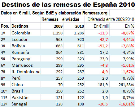 Senegal, Ecuador y Bolivia permanecen en crisis según el ranking 2010 de destinos de las remesas de España Paraguay, Rumanía y China lideran la recuperación de las remesas en 2010 Las remesas de España llevan varios trimestres con fuerte crecimiento a pesar de la situación económica. Ahora sabemos que no todos los colectivos inmigrantes están incrementando sus envíos. Mientras algunos permanecen en crisis, hay otros que están incrementando con fuerza sus envíos y que ejercen un efecto locomotora sobre el resto. Se trata además de destinos emergentes, diferentes de los principales destinos de las remesas de España. Éstos en 2010 están encabezados, como en años anteriores, por Colombia, que recibió €1.286 millones, apenas 11 menos que en 2009. Le siguen Ecuador y Bolivia con €920 millones y €611 millones respectivamente, aunque muestran caídas relevantes frente a los datos de 2009. En conjunto, esto supone que las remesas de España siguen concentradas en América Latina, a dónde van destinados más de la mitad de los €7.186 millones que España envió como remesas en 2010.
