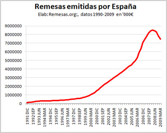 Las remesas caen en el 1º T un -17,2%---Actualizado el 1 JUL 09 El descalabro de las remesas de España continúa en el primer trimestre de 2009 El Banco de España acaba de anunciar una notable caída de las remesas emitidas en el primer trimestre de 2009. España envío remesas por valor de €1.653 millones entre enero y marzo de 2009, lo que supone una caída del 17,2% frente a los €1.998 millones mismo periodo de 2008. Con este trimestre, las remesas que emite España acumulan ya cuatro consecutivos de caídas, que comenzaron en el segundo trimestre de 2008, en que se redujeron en un -4,1%, profundizando la caída hasta el -6,1% en el tercero, e incrementándose hasta el -20,6% del cuarto trimestre de 2008.