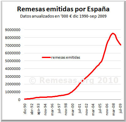 Sigue atenuándose su caída y el rebote podría ser inminente---Actualizado el 1 ENE 10 La caída de las remesas de España sigue deteniéndose en el tercer trimestre de 2009 con un -9% España emitió remesas en el tercer trimestre de 2009 por valor de 1.888 millones de euros, un -9% menos que en el mismo periodo de 2008. Con esta caída las remesas de España acumulan seis trimestres de consecutivos en rojo, uno más que el crecimiento del PIB, que solo lleva cinco trimestres de caída. Es cierto, en cambio, que la crisis de las remesas parece atenuarse ya que se trata de la menor caída desde el cuarto trimestre de 2008 en que estos flujos se redujeron en un -20,6%, desde dónde pasaron al -17,1% del primero de 2009 y desde ahí al -13,2% del segundo trimestre de 2009. Frente a este porcentaje, la caída del -9% en septiembre confirma la tendencia hacia un rebote.