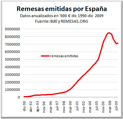 Crecen un 1,8% en el último trimestre del año---Actualizado el 31 MAR 10 Se acaba la crisis de las remesas en España España emitió remesas en el cuarto trimestre de 2009 por valor de 1.910 millones de euros, un 1,8% más que en el mismo periodo de 2008 en que envió 1.876 millones. Con este incremento las remesas de España cierran una crisis que supuso seis trimestres de consecutivos en rojo que comenzó en el segundo trimestre de 2008. Es importante reseñar que las remesas entraron en crisis un trimestre antes que el crecimiento del PIB. Ahora también salen antes de los número rojos ya que el PIB continúa en negativo. En los últimos trimestres se venía atenuando la caída de las remesas. En el cuarto trimestre de 2008 estos flujos se redujeron en un -20,6%, desde dónde pasaron al -17,1% del primero de 2009 y desde ahí al -13,2% del segundo trimestre de 2009. Frente a este porcentaje, la caída del -9% en septiembre confirmaba la tendencia hacia un rebote que se ha producido en el cuarto.