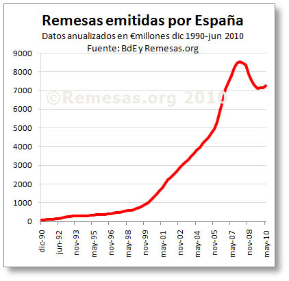 Crecen un 5% en el segundo trimestre de 2010---Actualizado el 30 SEP 10 Notable crecimiento de las remesas en España durante el 2º T de 2010 España emitió remesas en el segundo trimestre de 2010 por valor de 1.756 millones de euros, un 4,96% más que el mismo periodo de 2009, en que emitió 1.673 millones de euros. Se trata del mayor incremento intertrimestral desde 2008. Con este incremento las remesas de España confirman la salida de la crisis que supuso seis trimestres de consecutivos en rojo, entre el segundo trimestre de 2008 y el tercero de 2009. Las cifras recién presentadas incluyen una revisión de las del primer trimestre de 2010, que se han incrementado de 1.666 millones de euros a 1.668. Por ello, el incremento interanual del primer trimestre de 2010 pasa del anterior 0,6% al actual 0,7%.