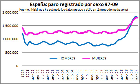 Esta misma tendencia se está dando en el mercado de trabajo nacional. Analizando las cifras del INEM, desde que disponemos de estadísticas siempre hubo en España más paradas que parados. Esto es, el desempleo era un fenómeno que afectaba más a las mujeres. Pero desde enero de 2009 la tendencia se ha invertido y por primera vez hay más parados hombres que mujeres. Ciertamente, la ventaja es escasa pues el 50,3% de los parados son hombres, mientras que el 49,7% son mujeres. Pero en enero de 2004 la proporción era 40% hombres 60% mujeres.