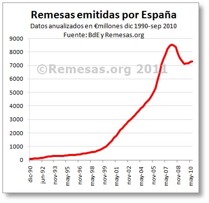 Crecen un 3,5% en el tercer trimestre de 2010---Actualizado el 2 ENE 11 Las remesas de España logran cuatro trimestres de incremento en el 3º T de 2011 España emitió remesas en el tercer trimestre de 2010 por valor de 1.955 millones de euros, un 3,5% más que el mismo periodo de 2009, en que emitió 1.888 millones de euros. Con este dato España acumula cuatro trimestres consecutivos de crecimiento en sus remesas que salieron de la crisis en el último de 2009 con un tibio incremento del 2,8%. Le siguió el 0,7% del 1ºT de 2010 y, con mucha mayor fuerza, el 5% del 2ºT de 2010. En conjunto, esto supone unas remesas interanuales (sumando los doce últimos meses a septiembre de 2010) de 7.310 millones de euros. Un dato que queda bien lejos del récord histórico de las remesas de España alcanzado en marzo de 2008 con 8.550 millones de euros.