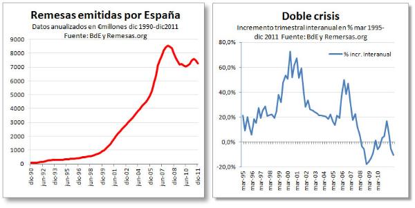 Crecen un 1% en 2011, aunque caen un 10,5% en el cuarto trimestre--Actualizado el 30 MAR 11 Las remesas crecen en 2011, pero inician una nueva crisis Las remesas de España ha cerrado 2011 con su primer incremento anual desde 2008. La cifra anunciada por el Banco de España para 2011 es de 7.267 millones, lo que supone un incremento del 1% frente a los datos de 2010. Este incremento anual se fraguó en los dos primeros trimestres de 2011, dónde se alcanzaron crecimientos interanuales del 17% y del 7%. No obstante, en el tercer trimestre cayeron en un -5,5% mientras que en el cuarto lo hicieron en un -10,5%. Estos datos sugieren que la economía de los inmigrantes en España se ha sumido en una nueva crisis en los dos últimos trimestres del año. En el gráfico se puede observar claramente que estamos ante una doble crisis, cuya segunda fase aún está en el inicio. Esto obliga a ser prudentes de cara a su posible evolución a lo largo de 2012. Mucho más si analizamos los datos de empleo inmigrante, donde todas las series estadísticas están en rojo. Al cierre de Diciembre de 2011 había 1,715 millones de extranjeros dados de alta en la seguridad social, lo que supone una caída del -5,5% frente a la cifra de diciembre de 2010, con 1,762 millones. Los datos de la EPA son aún más negativos arrojando una caída del número de ocupados entre el IV Trimestre de 2011 y el de 2010 del -8,5% con una cifra final de 2,294 millones..