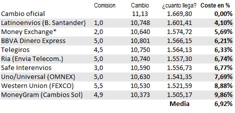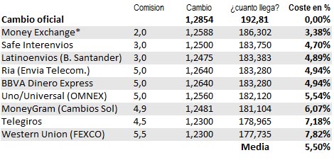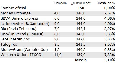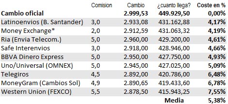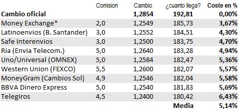 Ficha técnica: Los datos de remesadores responden a entrevistas telefónicas y visitas a locutorios realizadas a partir de las 12.00 horas del martes 9 de Diciembre de 2008. En el muestreo se recogen los precio de los 9 principales operadores del sector según el ranking de ventas que pueden encontrar en www.remesas.org/ranking08.html En conjunto, estos operadores disponen de una cuota del 80% del mercado. Por orden de cuota, según nuestro ranking de remesadores 2008, recoge el precio de Wester Union que posee el 30% del mercado junto al de Money Gram con el 16% asi como Omnex (9,7%), Envia Telecomunicaciones (8,2%), BBVA Dinero Express (7,2%), Telegiros (4,3%) Money Exchange(2,5%), Safe Interenvios (2,2%) y Latinoenvios, del banco Santander, la primera entidad financiera de España. Existen varias divergencias en la muestra respecto del ranking. La principal, es que tanto Telegiros como Safe han absorbido en 2008 a otras entidades por lo que su cuota de mercado actual es muy superior a lo que figura en el ranking. La segunda empresa del sector, Change Center, no facilita precios telefónicamente, pero incluimos a Cambios Sol, también integrada en la red de Money Gram. Uno Money Transfer es una de las marcas con la que opera Omnex, tercera empresa del sector. Por otro lado, en anteriores rankings ha figurado La Caixa, como principal Caja de Ahorros de España, pero en esta ocasión esta ausente por modificaciones de su política informativa. Ahora solo facilita precios para clientes cualificados, que tengan abierta cuenta en la entidad y/o, ademas domicilien la nomina. No se trata de precios al publico general. Asimismo, la entidad solo facilita el cambio en US$ para remesas a Colombia, mientras que el resto paga en Pesos. Igualmente, en el caso de Marruecos solo facilita el precio en euros, mientras que resto paga en dirhams. Esto hace que las tarifas que nos ha facilitado no sean aplicables a la clientela general ni tampoco sean comparables al resto del sector. Por primera vez, aparece en nuestro ranking la novena empresa del sector, Money Exchange. Los tipos de cambio son los oficiales al cierre del 8 de diciembre. El del euro es el de referencia del banco central europeo, de 1,2854 dólares por Euro disponible en ww.ecb.int. El del peso colombiano de 2.999,53 pesos por euro responde a la TRM (Tasa Representativa del Mercado), disponible en www.superfinanciera.gov.co. El del Dirham de 11,13 Dirhams por euro es el cours virement oficial del Bank Al Maghrib disponible en www.bkam.ma