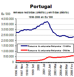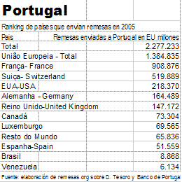 ¿A dónde van las remessas de Portugal? Portugal es un caso excepcional en Europa, dónde es uno de los pocos países que son receptores netos de remesas. Esto es, sus emigrantes superan a sus inmigrantes. La diferencia comenzó a reducirse al filo del año 2000, pero es tendencia parece haberse paralizado en el último año. Portugal recibió remesas en 2005 por valor de Eu2.277 millones mientras que las emitió por valor de Eu563 millones.
