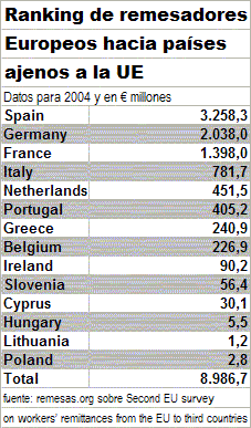 Bruselas señala que España es el primer remesador de la Unión Europea La Comisión Europea acaba de publicar un informe dónde revela que España es el primer emisor de remesas desde la Unión hacia terceros países. Este informe cifra en 8.986 millones las remesas emitidas en 2004 desde los países miembros hacia los países no miembros. De esta cantidad, España es el principal emisor con casi el 40%, o bien 3.258,3 millones. El informe, titulado Second EU survey on workers’ remittances from the EU to third countries ha sido elaborado por la Dirección General de Asuntos Económicos y Financieros de la Comisión. Para elaborarlo, investigaron los datos sobre remesas de todos los países miembros. Para sorpresa de la Comisión, de los 25 países miembros solo 14 disponen de una cifra sobre las remesas que envían a terceros países. Del resto, ocho carecen de cualquier dato al respecto. Entre ellos, figuran naciones recién incorporadas a la Unión y en las que la inmigración es un fenómeno de escasa relevancia, como es el caso de la República Checa, Malta o Eslovaquia. Pero también hay algunos miembros veteranos en los que la inmigración tiene unas dimensiones significativas y, por ello, cabe pensar que son importantes emisores de remesas como Dinamarca, Luxemburgo, Austria, Finlandia o Suecia.