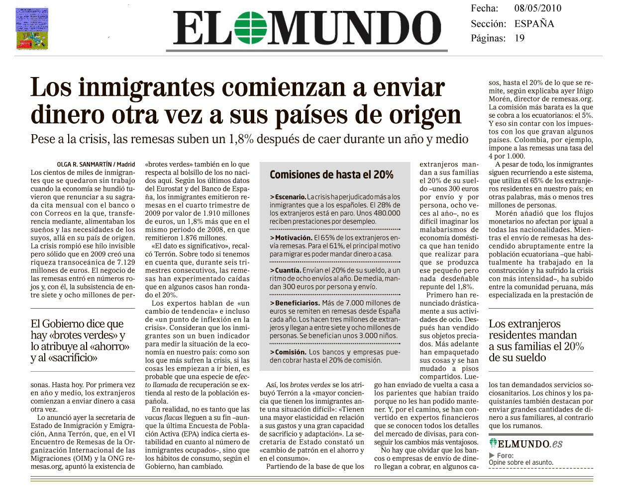 Los inmigrantes enviaron 1.835 millones a su países en 2009