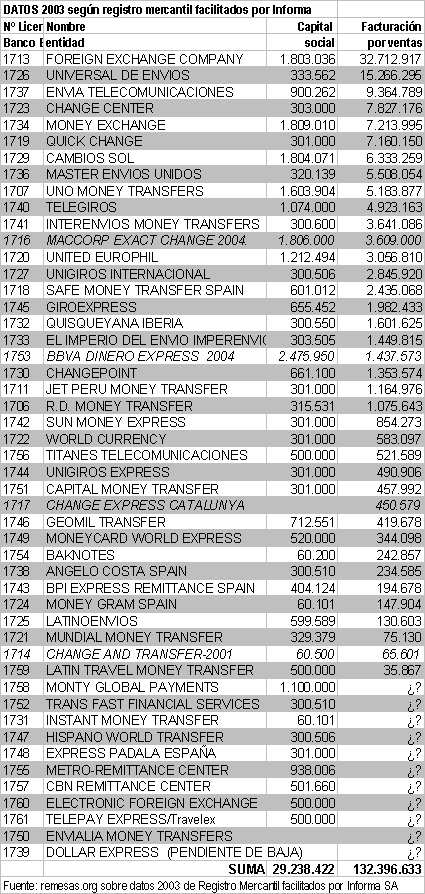 Datos correspondientes al ejercicio 2003 ordenados por facturación. Solo incluye empresas remesadoras con